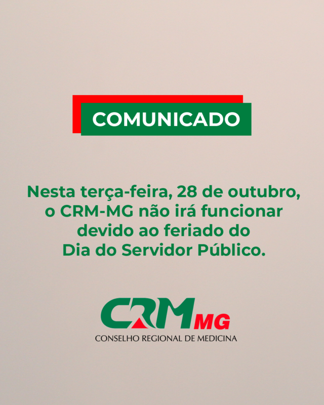 Nesta terça-feira, 28 de outubro, o CRM-MG não irá funcionar devido ao feriado do Dia do Servidor Público. Os serviços médicos oferecidos pelo Conselho continuam disponíveis no CRM Virtual, nosso Portal de Serviços. Acesse: portalservicos.cfm.org.br/portal/mg