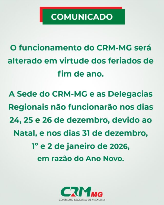O CRM-MG não funcionará dias 24, 25 e 26 de dezembro, devido ao Natal, e dias 31 de dezembro, 1º e 2 de janeiro de 2026, em razão do Ano Novo.